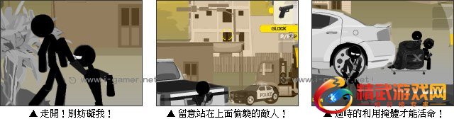 游戏操作:以键盘 A、D 键操作人物移动,AD + S 键向左或右翻滚,W 键跳跃,空白键捡物品 / 攻击 / 背靠建筑汽车躲避子弹, R 键填充子弹。