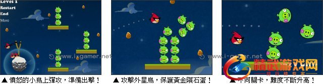 游戏操作:以滑鼠点击拖动小鸟调整角度和力度,鬆开左键发射小鸟。