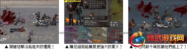 游戏操作:以键盘方向键操作摩托车移动,滑鼠瞄準射击,数字键 1、2、3 键使用道具 (需购买)。