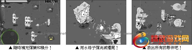 游戏操作:以键盘方向键操作海绵宝宝移动,滑鼠移动瞄準射击。