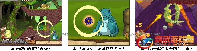 原始人要怎么大战恐龙?人类偶然学会使用岩浆椰子炸弹,只要控制好投掷的方向与力道,正确的击中恐龙就能炸死牠们,但是守护蛋的龙可不只有一只,因此你必须在有限的炸弹数完成任务,赚到钱后还能购买特殊种类的炸弹哦。在史前时代小心别被恐龙给吃啰!