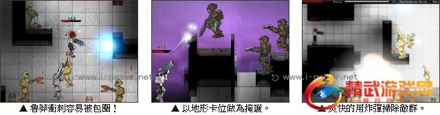 1. 以键盘方向键操作人物移动,滑鼠瞄準射击。