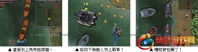 游戏操作:以键盘方向键操作主角移动,Q 键上车(船)下车(船),滑鼠瞄準射击。