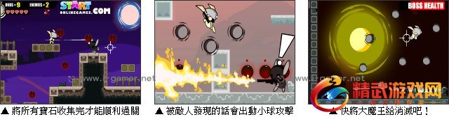 兔子杀戮黑枪战是一款横向闯关的枪战游戏。你要控制这只兔子将所有的敌人消灭外,还要把散布的红宝石全部收集到,才可以顺利过关。要注意如果被黑兔子发现的话,他们会发动小球及火焰攻击喔!