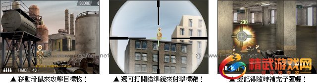 游戏中玩家将扮演一位狙击手,在正式执行任务之前,必须先经过重重的标靶训练,才能够成为一位专业的特务狙击手。现在就先从最基本的打靶测试开始,对準目标射击吧!