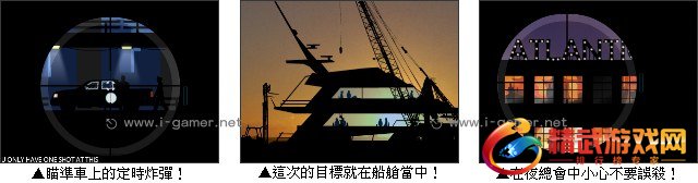 游戏操作:以滑鼠操作进行游戏,不可滥杀无辜喔!第一关,射掉所有的靶。第二关,射杀船上第二层最后面的人,速度要快,船停止时会被遮住 ...