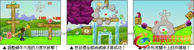海绵宝宝的宠物小蜗是一只善良的小蜗牛,由于胆子比较小,所有它经常受到海底世界其他伙伴们欺负。今天,小窝就要进行复仇行动,牠要利用蜗牛大炮,射击远处那些躲避在积木里的那些常欺负牠的人。每一关只有 3 到 5 次的射击机会,击落所有欺负牠的人即可过关!