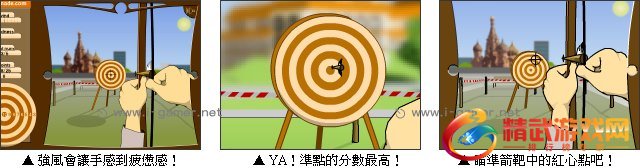 这是一款射箭比赛游戏,游戏中玩家要参加世界弓箭的轮迴赛,争取世界排名。随着关卡增加,射击难度也跟着增加,而且射击中还要考虑风向及疲倦度两项变数,掌握不好将会影响到玩家的準确度。要如何才能克服这些问题,就靠玩家的技巧啰!
