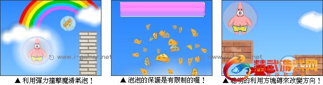 海绵宝宝和派大星这对好哥们可说是难兄难弟,天真的派大星因为贪吃,被困在了一个魔法气泡里出不来,无所不能的海绵宝宝为了抢救好朋友,想到把自已变成一个三角型的小棉球发射出去,利用弹力去撞击魔法气泡救出派大星!
