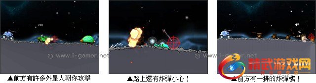 游戏操作:以键盘方向键操控车身方向移动,滑鼠瞄準目标按左键射击。