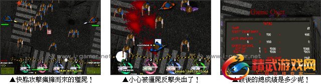 有两名英勇的战士决定要上场对付可怕的殭尸,于是就此展开了一场激烈的战斗,玩家们要同时操作两名战士的方向移动,攻击的时候两个人会一起同时射击,殭尸的数量越来越多了,必须要好好守住最后的底线,画面中会不定时的出现道具,要尽量取得喔!