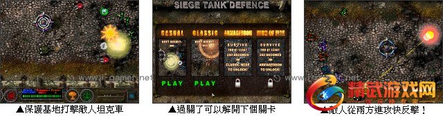 这是一款以坦克车为主的守城游戏,进入游戏后中央有一座基地,玩家们要保护他不被攻下,敌人会从你的左右方进攻,右方的敌人会全力进攻基地台,左方的敌人会以攻击坦克车为主,你要小心防守并且攻击敌人,如果让敌方靠近基地或是我方坦克被攻击就会减少血量。打倒敌人后可以获得一些道具提升能力或增加防御,记得多加利用。