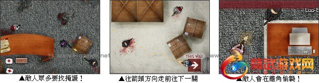 游戏操作:以键盘WASD键操作方向移动,滑鼠瞄準目标按左键射击,CTRL 捡取武器,空白键补子弹。