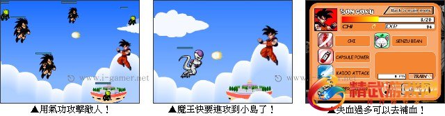 这款七龙珠的游戏中,玩家必须要操控主角悟空来防卫地球,敌人会从左边攻击过来,你要使用气功将他们打回去,画面上方是你的生命值,EXP 是经验值,UPGRADES 为升级功能,点进去可以使用经验值换取更强的招式或是补血!