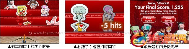 这回邱比特要把爱神的箭射给需要的人,游戏中前面有3个台阶,会出现很多人行看板在上面移动,有时候速度会加快喔,在看板的上面有爱心才可以向他射箭,如果射错了会被扣时间,看看你能再限定时间内设中几个人吧!