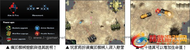 游戏操作:以键盘方向键或 W、A、S、D 键控制机械人移动方向,滑鼠瞄準,按左键射击。