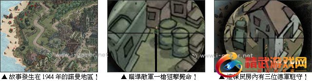 诺曼地登陆是发生在 1944 年的诺曼地区,主角是突击队的狙击手,为盟军的先锋部队开路。游戏任务就是帮助主角狙击诺曼地区驻守的德军,掌控这个城镇。游戏中每关指有指定任务,必须在时限之内完成任务!