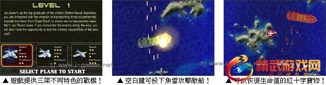 游戏操作:以滑鼠操作战机移动方向,左键是机枪射击,键盘上空白键可投下鱼雷攻击敌船,鱼雷落入水中会直线前进直到击中陆地或敌船。