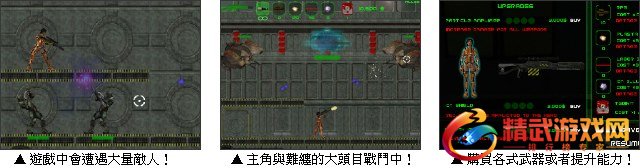 游戏中有些门会锁住,玩家必须寻找开门的磁卡,而且必须时同颜色的才能打开。游戏中玩家如果看到有会发出类似闪光的仪器时,靠近它按空白键可以进行储存进度的动作。敌人的数量庞大,发射的子弹也是很多,因此找寻适当地点做掩护是很重要的,一般武器无法穿越平台,因此上下层的平台将是掩护玩家的好地点。尤其是大头目出现的时候,常会伴随着大量的攻击,玩家如无法做好躲避的动作,是很快就会阵亡的。游戏过关后,可以拿在游戏过程中所赚得的金钱,用来购买提升本身能力、各种武器的子弹或者医药箱等等,这些项目非常重要,因为如果不提升或购买武器,对于愈来愈困难的关卡将难于应付。