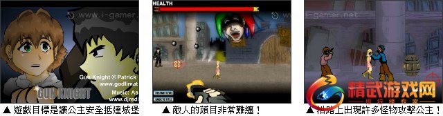 这是一款射击游戏,玩家将扮演公主的护卫,要帮助公主来击退一路上所出现的恐怖怪物,让公主安全抵达城堡。游戏上方所出现的长条显示图,是代表公主的生命值,一旦遭受敌人攻击就会降低,当降到底时游戏就会结束。另外游戏中如有出现医药箱,玩家记得赶紧射击医药箱,这样可以补充生命值。