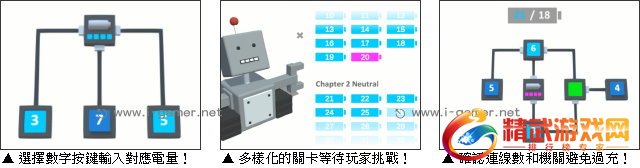 另外,随着玩家充饱的电池越多,难度也会逐渐提升,此时优秀的观察和推理能力可就是重点啦!例如在某些关卡中,玩家需要留意连接电池及按钮之间的线路,因为依照连线数量的差异,输出的电量可是会以倍数增加,一时不察就会超额失败!而在某些关卡,特别安置的机关又会在其中起到不同的效用,需要玩家一一确认,并且谨慎使用唷!现在就来动动脑,体验完美凑到指定电量的艺术吧!