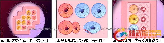 游戏操作:以滑鼠操作进行游戏,长按左键拖曳细胞,使它分裂。