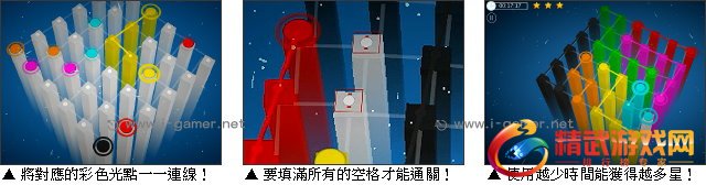 游戏操作:以滑鼠操作进行游戏,点击彩色亮点,长按拖曳出对应色线。