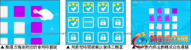 元素简单,进行起来却相当烧脑的《颜色方块翻一翻》,准备要来考验热爱益智游戏的玩家喽!进行的方法很简单,玩家需要藉由点击画面上的紫色方块,使它翻面成为白色,而每次翻面,都会产生连锁反应,带动附近的特定方块一同翻身!因此,玩家需要费心的便是,如何使用最短时间,以及在限定次数内,将所有方块转为白色,达成通关,这绝对不是直觉的随意翻翻就能完成的唷!准备好尝试拿取所有关卡的三颗星星了吗?现在就开始你的挑战吧!