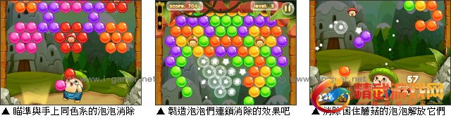 游戏操作:以滑鼠操作进行游戏,移动滑鼠调整气泡方向,点击滑鼠左键发射泡泡。