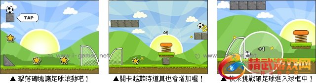 游戏中玩家需要想办法将足球滚进球框里,首先要先想好足球掉落位置,再将砖块击碎,才能在合适的地方掉落并且滚动,紧接着运用周围的道具加重速度,使足球往球框方向进入,每个关卡障碍物不一样,关卡越难障碍物越多, 玩家们快来挑战喔!