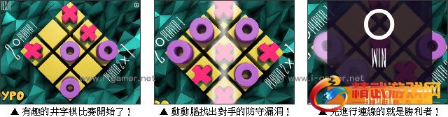 井字棋是一款风靡全球的知名游戏,想必大家都不陌生吧。游戏中可选择电脑模式或双人模式,玩家要轮流在 3 乘 3 的方格上轮流打自己的符号,最先以横、直、斜连成一线则为胜,如果双方都没有连线将为和局。玩家们还在等什么呢?快相约好友一同较量吧!