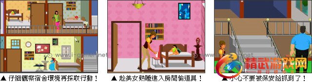 男主角在学校迷了路,误入女生的宿舍,他必须趁美女们都在睡午觉的时刻逃出去才行。游戏里会有保安、宠物或是在走廊徘徊的美女,玩家们要仔细探索场景中的每个角落有无可用的道具,并利用这些道具转移他们的注意力,如果被发现可是要重头来过喔。玩家们快来帮助男主角逃出美女宿舍吧!