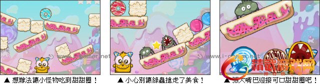 萌萌小怪汤姆来到甜点岛寻找它最爱的甜甜圈,但要取得美食必须要克服一些阻碍,我们来帮帮它吧。这里的一切都是由各式各样的甜点建造而成,玩家的任务是要让甜甜圈顺利滚到汤姆的嘴巴里,过程中要尽可能吃到所有的星星以获取高分,并且小心食物别被绿色怪物给抢走啰,快来把汤姆喂饱吧!