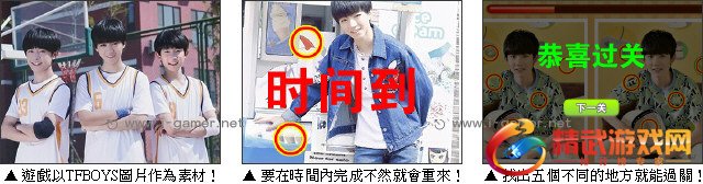 「TFBOYS 大找碴」将考验玩家的眼力!游戏中精挑细选了几十张 TFBOYS 图片作为游戏素材,玩家必需在时间限制内找出五个不同的疑点就可以继续挑战下一关,否则只好从头来过。玩家们快来仔细观「碴」,疑点就在意想不到的地方喔!