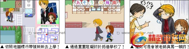 铃铃铃,闹钟响了,又到了起床准备上学的时间啦!把上课需要用到的物品整理到位,然后等待哥哥准备好就可以去学校了。游戏中玩家有三分钟的时间带妹妹去上学,首先要拟定路线,途中会有路障、红绿灯、公车阻挠,要是时间结束还没有抵达可是会被老师给臭骂的。玩家们快来送可爱的妹妹去上学吧!