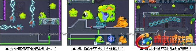 游戏操作:以键盘方向键或滑鼠操作变形怪移动与跳跃,数字键 1 ~ 4 键切换角色。角色1可以行走 / 跳跃 / 附体、角色2可以攀爬、角色3可以推动箱子 / 撞碎冰墙,角色4(机器人) 可以触动机关。