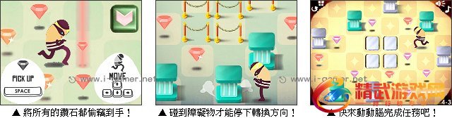 游戏操作:以键盘方向键操作钻石大盗移动,空白键偷取钻石,S 键查看攻略 (有冷却时间),R 键重玩。