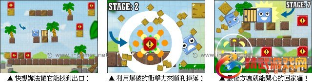 小方块独自一人到外面玩耍,不小心迷路了无法回家,他现在非常需要大家的帮忙与协助,快来一起帮助方块能顺利抵达到家吧。游戏中需要点击附近的道具,产生爆破的冲击力,就可以让方块成功滚动到出口,这样就能顺利过关啰,共有 24 道关卡赶紧来跳战看看吧!