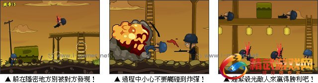 在第二次世界大战中,纳粹军队以先进武器大肆入侵,眼看盟军慢慢陷入劣势,于是派遣战地特工去执行任务,任务是侵入地方阵营破坏敌人的新式坦克。一开始必须靠着聪明的头脑,利用环境周围的物品来触动机关,来帮助特工能顺利杀光所有敌人,快来动动脑帮助他能顺利消灭所有的人吧!