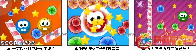 贪吃的暴牙球最爱的就是那五颜六色的香甜糖果了,玩家必须在正确的位置放下暴牙球,才能帮助牠们将糖果吃光光,游戏重点在抓准时间和挑选位置,有时必须一次放出数颗暴牙球才能过关,要注意只能吃与自己颜色相同的糖果喔。现在就让我们来帮助暴牙球吃糖果吧!