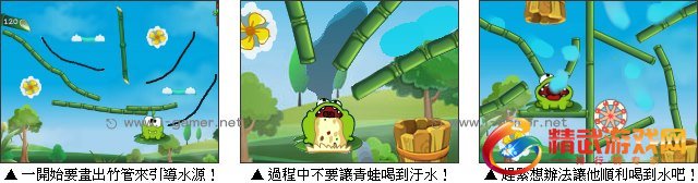 游戏操作:以滑鼠操作进行游戏,点击左键画出水移动的路径让青蛙喝到水,再点击竹筒就可以出水。