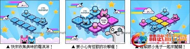 炎炎夏日的到来,爱吃霜淇淋的小兔子也准备大吃一餐,牠们必须突破关卡才能得到美味可口的霜淇淋。游戏中操作兔子跳跃前进,小心不要跳错地方,不然就吃不到了。快来一起帮助牠们更多的霜淇淋来渡过炎热的夏天吧!