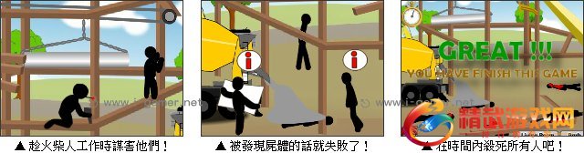火柴人正在工地里努力的工作,可是他们不知道死神已经来到他们的身旁,准备引起一连串的意外。玩家必须观察工地的情形来决定何时让意外发生,如果没有抓好时间点或是被其他火柴人发现的话就失败了,仔细思考如何让火柴人依顺序死掉吧!