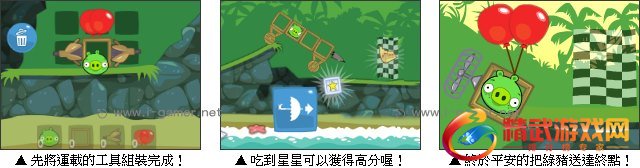 捣蛋猪推出 HD 3.0 版本啰,每次都被愤怒鸟欺负的绿猪们,这回终于可以翻身成为主角了,发挥你的创造力和观察力,帮绿猪找到藏宝图吧!游戏中玩家要帮助这些可爱的小绿猪设计一款由轮子、火箭、螺旋桨、发动机、弹簧、气球、雨伞等部件组成交通工具,在愤怒鸟的场地上尽情的捣蛋,快来一起动动脑吧!