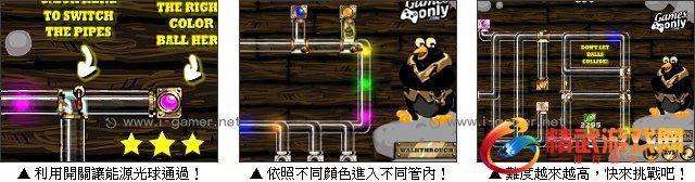 游戏操作:以滑鼠操作进行游戏,点击按钮改变管道方向,将球送到相对应的收集器即可。右下角的双箭头可加速光球的滚动,圆箭头可重玩关卡。