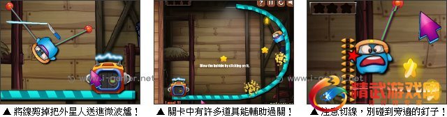 游戏操作:以滑鼠操作进行游戏,点击外星小怪连接按钮或切割线条,使他能够顺利进入微波炉。