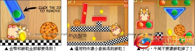 男孩和小仓鼠是一对好朋友,每次要喂食的时候总是亲自拿到牠面前给牠吃,养成懒惰的性格,导致现在小仓鼠肥滋滋的。于是小男孩设计了很多关卡,打算运用小玩具让小仓鼠运动一下。游戏中点击物件让玩具鬆脱,动动脑让小仓鼠吃到金币和饼乾喔!