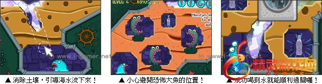 游戏操作:以滑鼠操作进行游戏,消除泥土将清水引导到小胖鱼处。沿途若遇到争夺清水的其他鱼,注意绕过牠们哦。