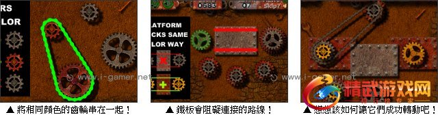 游戏操作:以滑鼠操作进行游戏,点击两个相同颜色的齿轮即可装上链子,让所有的齿轮转动起来,R 键重玩。