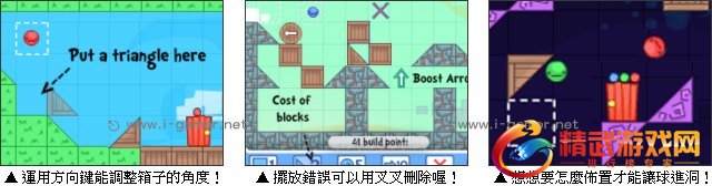 游戏操作:以滑鼠选择适当形状的木箱放置,左右方向键转换木箱方向,点击 START 开始让小球滚进洞。
